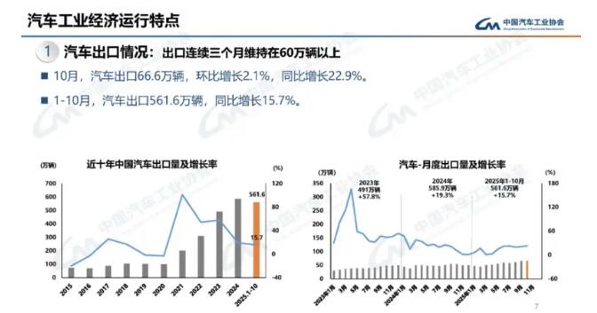 近日,中國汽車工業(yè)協(xié)會(huì)發(fā)布的最新數(shù)據(jù)顯示:我國新能源汽車出口首超200萬輛。1-10月汽車出口561.6萬輛,同比增長15.7%。