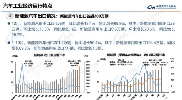 數(shù)據(jù)顯示,10月份我國新能源汽車出口25.6萬輛,環(huán)比增長15.4%,同比增長99.9%。其中,新能源乘用車出口25萬輛,環(huán)比增長15.3%,同比增長1倍;新能源商用車出口0.6萬輛,環(huán)比增長20.6%,同比增長26.7%。